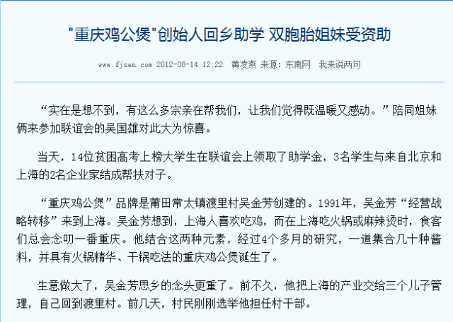 一篇海峡都市报刊登的新闻《“重庆鸡公煲”之父回乡助学 双胞胎姐妹受资助》则称:“重庆鸡公煲”品牌是莆田常太镇渡里村吴金芳创建的。1991年,吴金芳“经营战略转移”来到上海。吴金芳想到,上海人喜欢吃鸡,而在上海吃火锅或麻辣烫时,食客们总会念叨一番重庆。他结合这两种元素,经过4个多月的研究,一道集合几十种酱料,并具有火锅精华、干锅吃法的重庆鸡公煲诞生了。