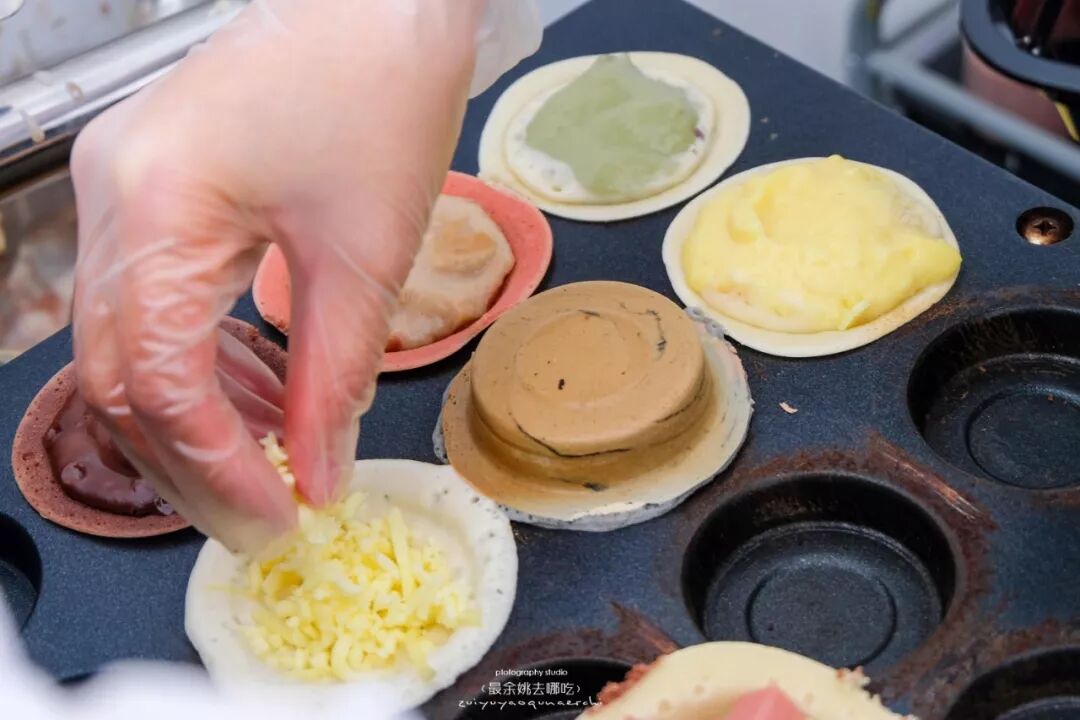 待底座稍微成型泛金黄色时,加入满满的内馅和卡仕达酱,每个车轮饼都是现点现做,新鲜出炉要趁热吃!