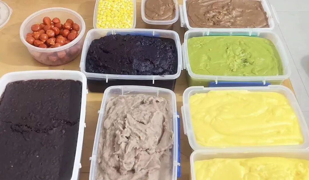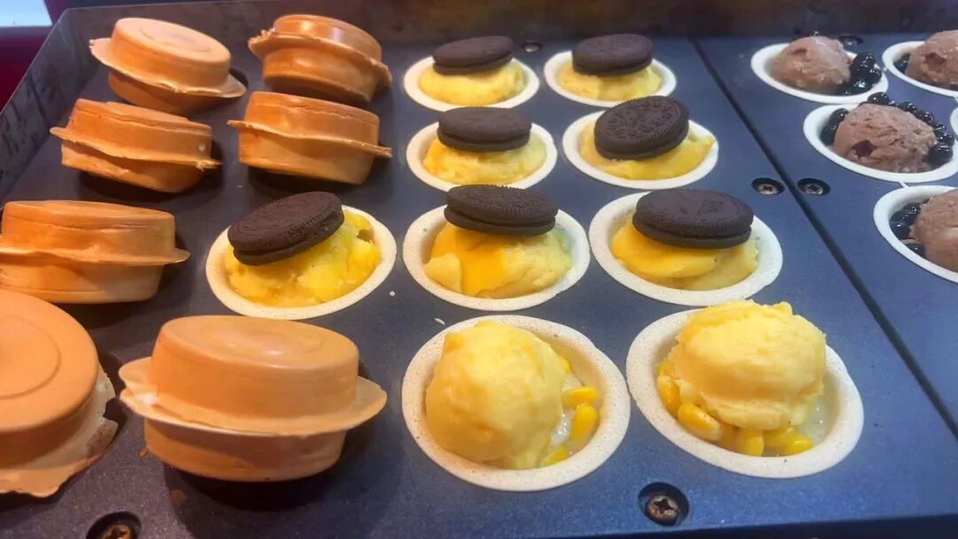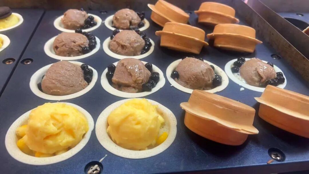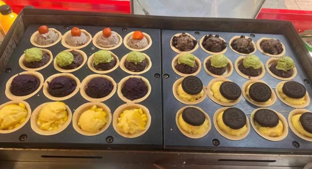 在预热好的模具上刷上一层薄薄的面糊,紧接着用工具将面糊均匀和开,再往面糊中加入各种口味的馅料。