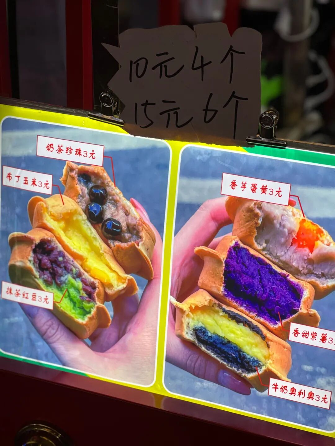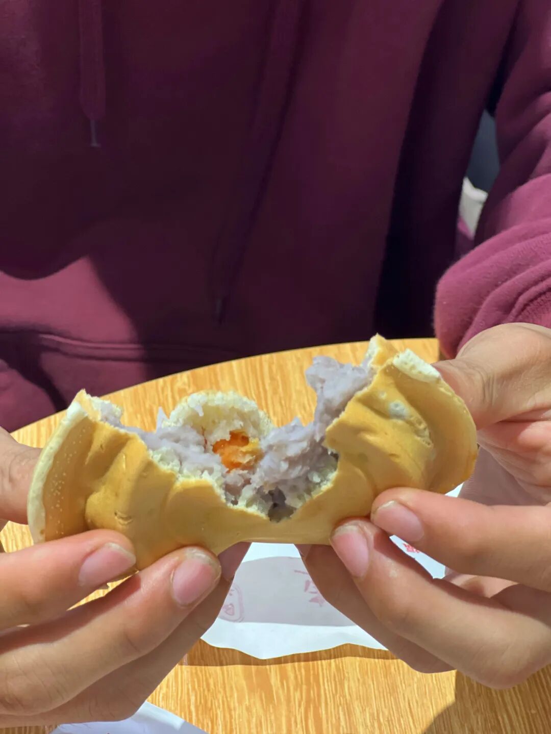 珍珠奶茶味应该算是店里的明星产品了,听名字就让人蠢蠢欲动,整杯珍珠奶茶都浓缩在小小的车轮饼里。薄薄的外皮下满满当当的都是奶茶酱和大粒珍珠,就是小编吃的时候已经凉了,口感上有些硬了,建议大家趁热吃哦~芋泥重度爱好者/香芋蛋黄味