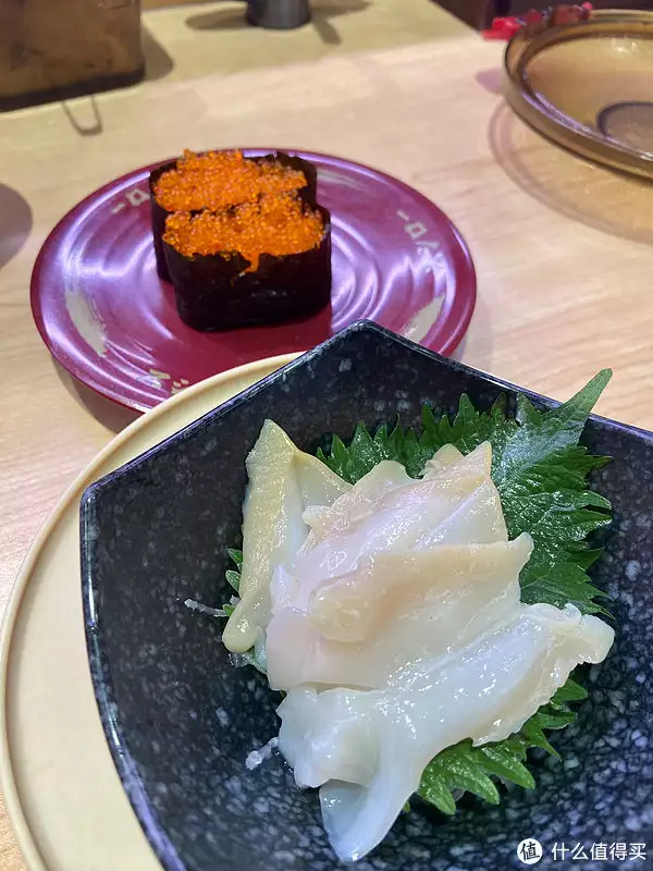 海螺刺身:比较滑,口感不错,但是有点“筋”,吃到“筋”的时候口感没有那么好;个人很喜欢垫刺身的紫苏叶,蘸点咸酱油很绝。