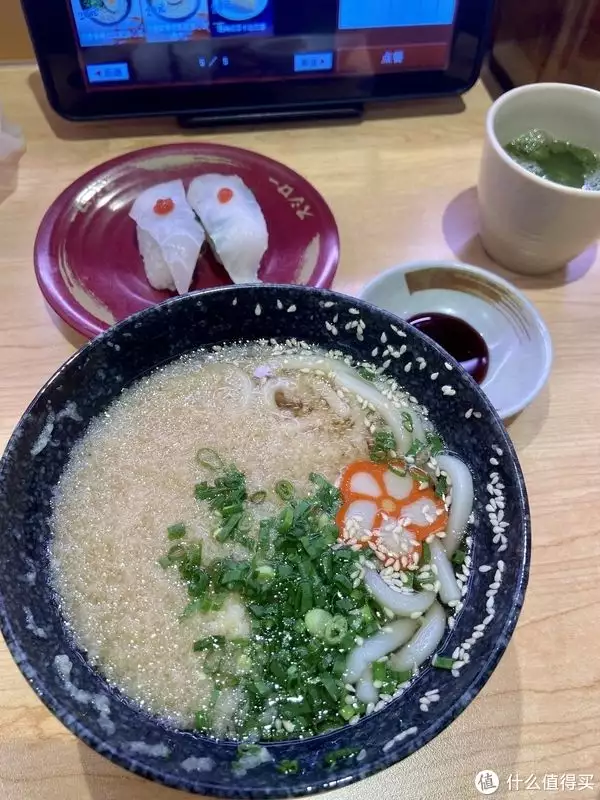 素乌冬:个人爱好,满满的白芝麻、葱花和炸过的“不知道什么名字”泡汤之后软软的,汤乌冬吃完暖呼呼的;一般我会先吃1/3填肚子,吃点寿司吃点乌冬这样交替。