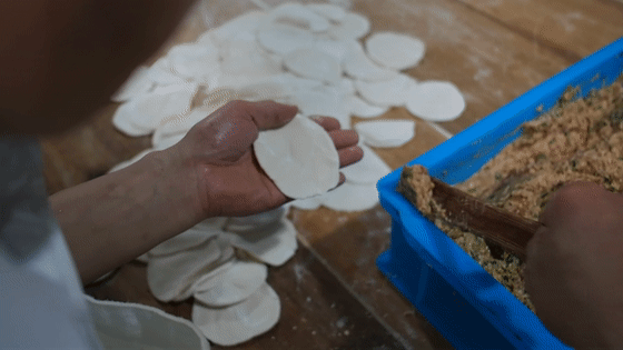 包馄饨,更是有讲究,圆型的饺皮,大师傅一手托皮,一手用一头扁、一头尖的竹片,挖一块馅抹在面皮上,左手合掌一捏,右手用竹片尖那头,一带一捺,一个馄饨包好,高手的师傅,一分钟,飞花式的能包几十只。