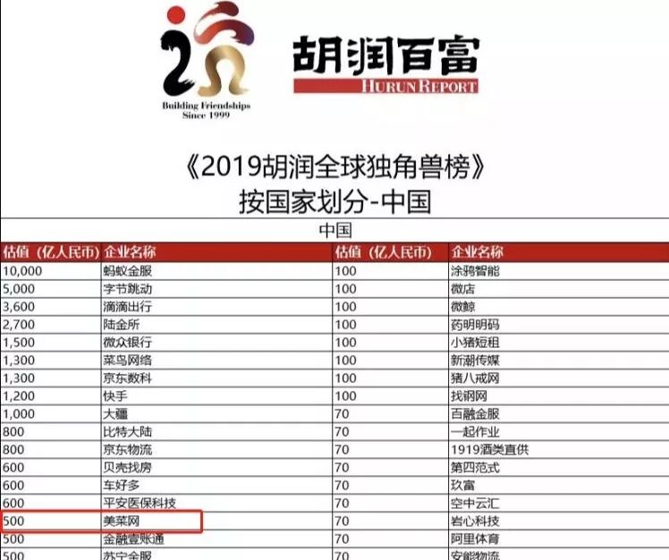 继去年之后,胡润刚刚发布的2019全球独角兽排行榜上,我们再一次看到了“美菜网”的名字。