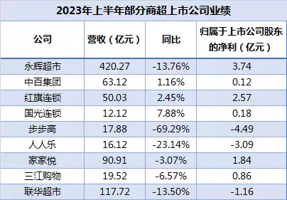与永辉超市一样,受到线上渠道、社区团购及消费者习惯改变等冲击,上半年,商超企业业绩恢复缓慢,多数通过关闭卖场止损。
