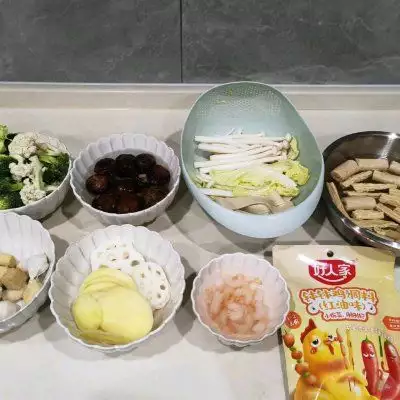 1、先准备好自己想吃的食材,比较推荐的是西蓝花、菜花、空心卷、豆腐皮、鱼丸、鱼豆腐、土豆片、藕片、大虾、无骨鸡爪、毛肚等。其实这道菜没什么可教学的,主要需要注意的还是各种食材需要水煮的时间。