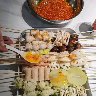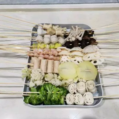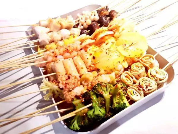 6、以上的食材就是钵钵鸡比较经典的一些常见食材,如果有其他想吃的食材,可以根据个人喜好调配,各类食材水煮的时间可以自己去网上搜一下,一般都可以找得到。食材全部处理完后,用竹签串起来即可。穿串其实也是一门手艺活,不过这个也没什么可教学的,凭个人手法串上去不掉就OK了。