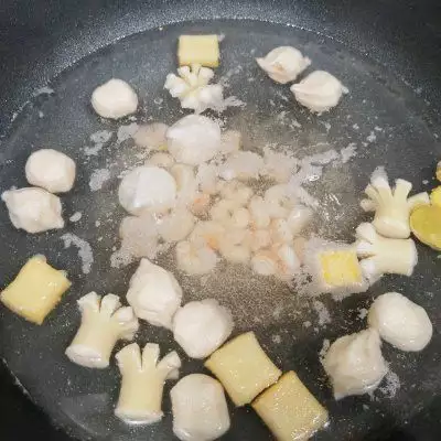 4、各类丸子的话一般煮7~8分钟即可,大虾的话煮5分钟就OK了,煮这类食材的时候记得加姜片和葱段,以及适量料酒,以此达到去腥的目的。