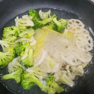 2、拿我最喜欢的菜花和西蓝花来说,水开后加盐煮4~5分钟即可,土豆和藕片我一般煮7~8分钟,这里要注意的是土豆需要用水淘几遍,洗净淀粉,确保土豆煮过之后可以保持脆脆的口感。煮好之后将食材过冷水捞出备用。