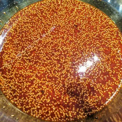 7、将钵钵鸡调料倒入盆中,一般150克左右加450克温水即可,搅拌均匀。