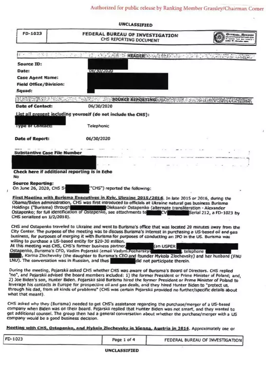 报道称,根据格拉斯利公开的“FD-1023”文件,乌克兰天然气公司布里斯马控股的拥有者米科拉·兹洛切夫斯基2016年在奥地利维也纳的一家咖啡馆与联邦调查局线人会面时告诉对方,他“付给一个拜登500万美元,还付给另一个拜登500万美元”。文件写道,“兹洛切夫斯基发表了一些评论,称虽然亨特·拜登‘很傻,他的狗比亨特都要更聪明’,但兹洛切夫斯基需要让亨特·拜登(继续留在布里斯马控股公司董事会),‘这样一切都会好起来’”。线人问是亨特·拜登还是乔·拜登告诉兹洛切夫斯基应该“留住”亨特,兹洛切夫斯基回答说,“他们都这么说”。