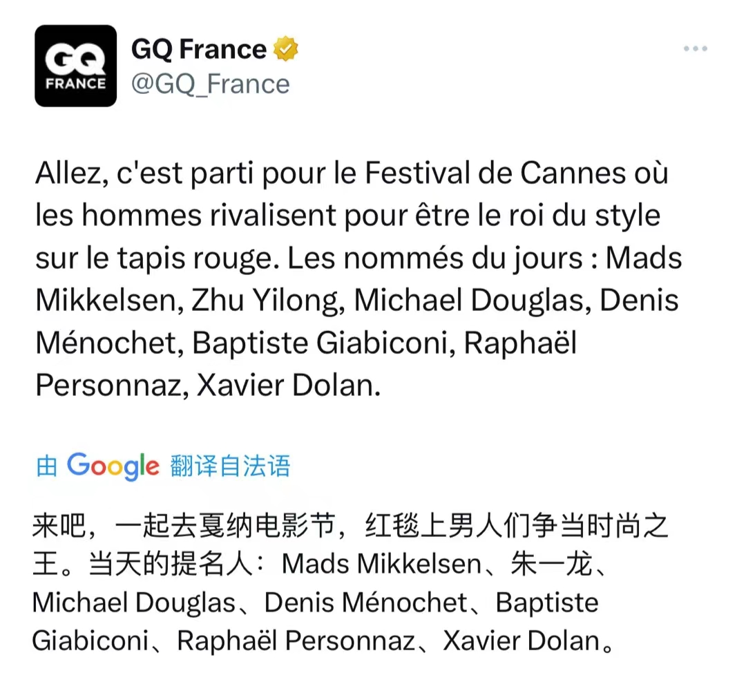 法国GQ提名的开幕式最时尚的十位男星,“在红毯上引起轰动的男性剪影” ,中国演员朱一龙名列其中—— 唯一的华人面孔