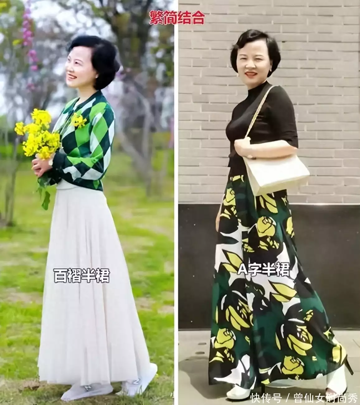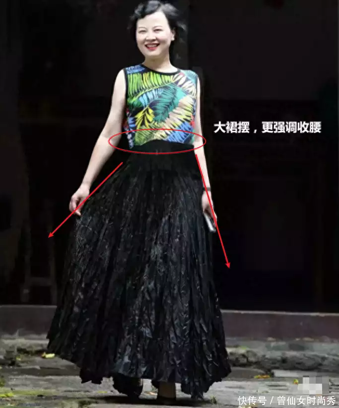 这种大宽摆的半裙更遮肉显瘦,不过,相比于容貌A字款,高腰线需要更为明显。