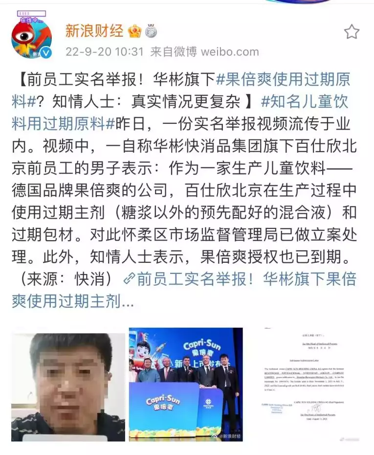 据新浪财经微博消息,近日,一则关于华彬集团旗下果汁饮料品牌——“果倍爽”的实名举报视频流传于业内。