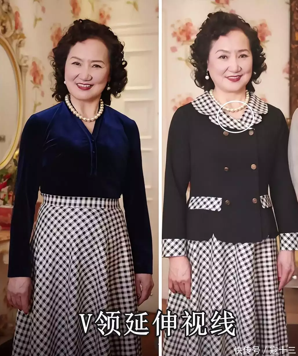 如果觉得V领气场太强,想柔化自身气质,可以像外婆这样,选择内尖外圆的翻领,无形中还有减龄效果。