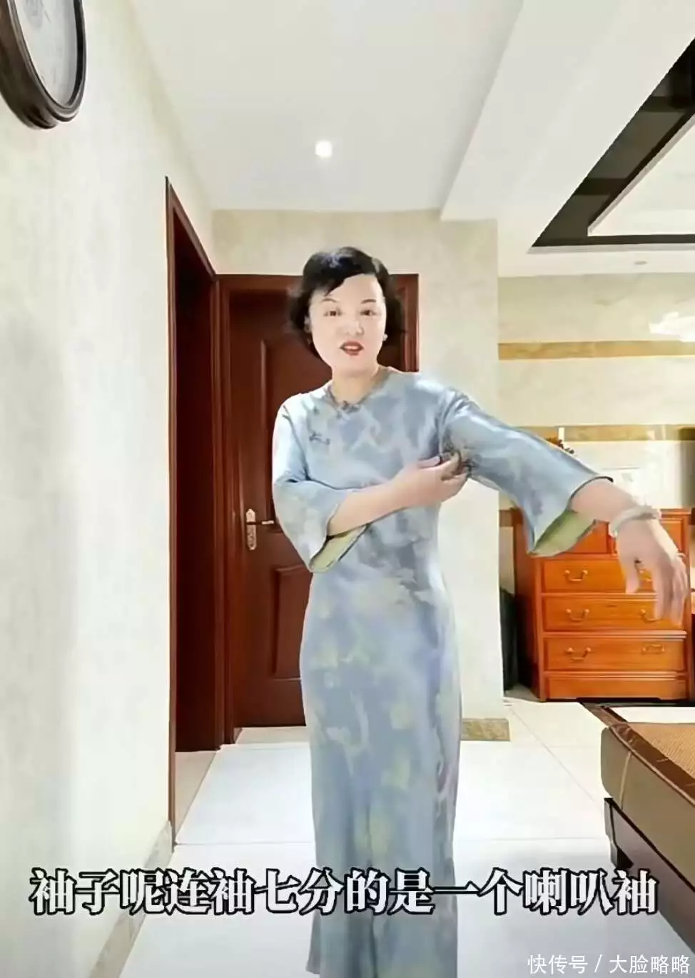 这位外婆骨架小,身上长点肉看着也不明显,但只要她穿错了衣服,就能很明显发现她苹果型身材典型的上身壮、肩背厚实,手臂浑圆等问题。