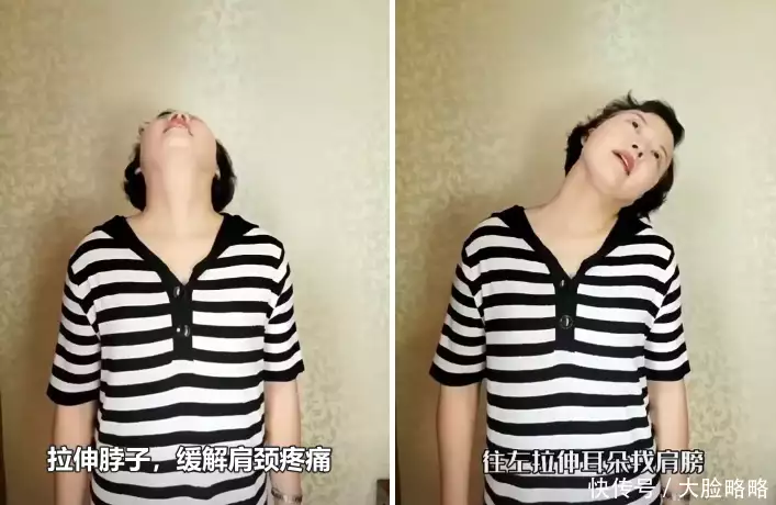 除此之外,外婆就经常做肩颈保健操,脖子分别朝前,后,左,右,用力,保持10秒钟后继续下一个方位的拉伸,像这样舒展皮肤对于淡化颈纹也有一定的好处。