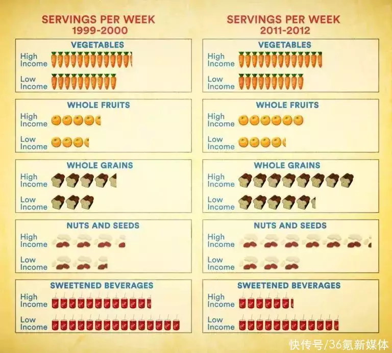 美国媒体statnews发现,从2000年到2012年,美国社会整体的全谷物摄入在随着社会发展逐渐增多,但贫富差距依然存在。只有高收入人群才会减少对精制谷物的消费,例如白面包和玉米片。