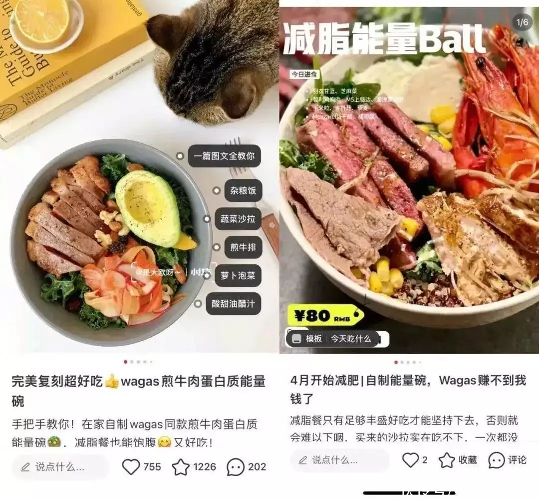 小红书备受喜爱,仿Wagas自制“煎牛肉能量碗”、“鸡肉牛油果芒果沙拉”,都在强调优质脂肪和高蛋白的饮食密码。