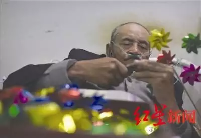 >因为慢性肺气肿,胡远根常常是一边躺在床上吸氧,一边扎风车。随着年纪越来越大,他常常喘个不停,手也抖个不住,扎一个风车要很长时间。有人曾经问他准备做多久,他说,只要活着就会坚持。