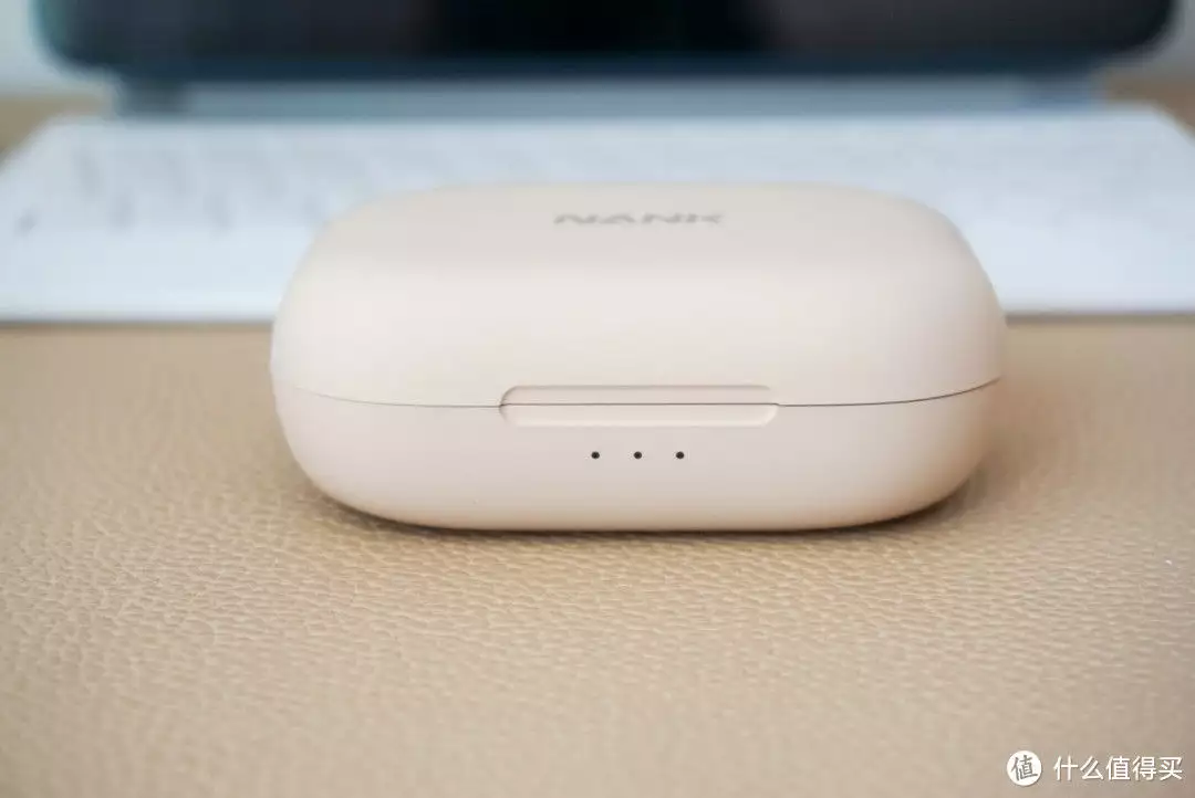 南卡NANK 00压系列的OE- CC的充电仓设计将极简风展现的淋漓尽致。小巧的充电仓外观设计如同女生用的化妆盒般大小。仓盒顶部是NANK的Logo,正面有三个充电仓指示灯,不仅可以显示充电状态,还可以显示充电仓电量剩余情况。