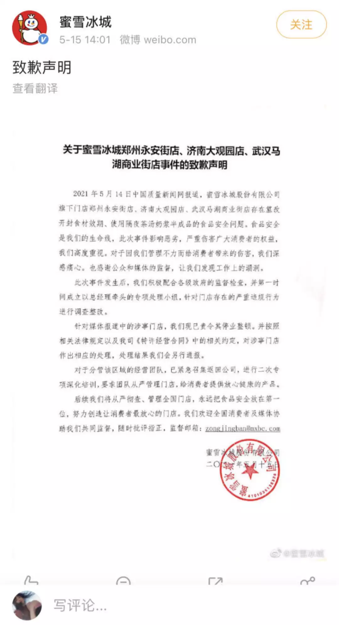 去年5月,蜜雪冰城因使用隔夜茶汤,篡改等食材时期等问题,被郑州市市场监管总局约谈。随后,郑州责令蜜雪冰城对35家门店进行整改,3家门店立即停业整改,并下达行政处罚决定书。