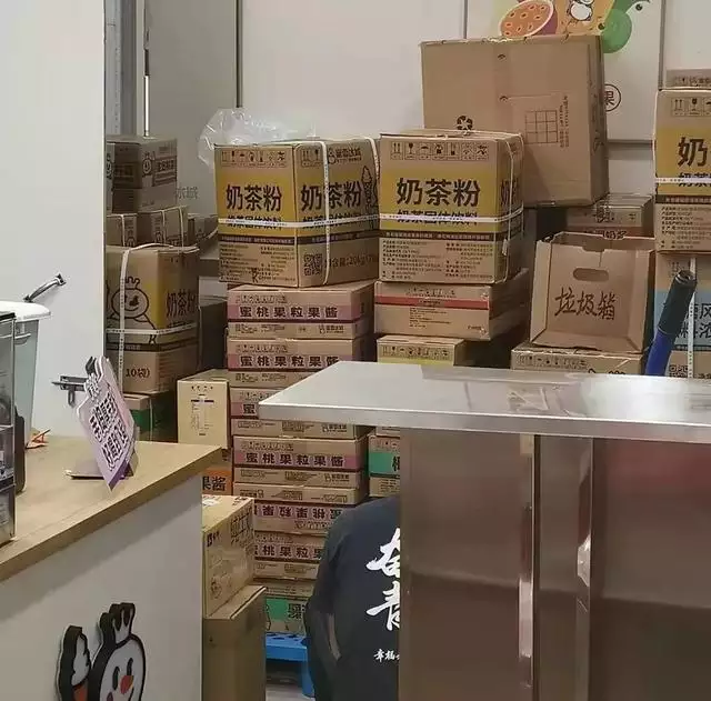 图|蜜雪冰城的门店仓库堆积着各式各样的原料
