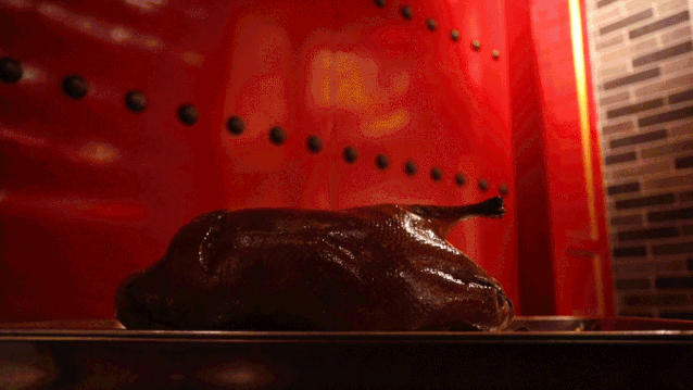 坚持用传统的挂炉方式烤制,80分钟的烤制,肉汁满满,枣红色的鸭皮更是诱人!