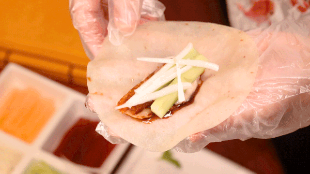 片胸脯皮、片鸭肉、片鸭肘...经过师傅精湛的刀工,这诱人的红枣色,油光锃亮的脆皮,像极了故宫里的贵价藏物。而且,烤鸭的吃法也十分有讲究,将仪式感进行到底...