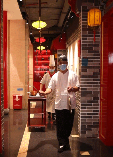 在「皇宫」吃北京烤鸭,仪式感一步都不能少!只要点整只烤鸭,师傅就会敲着大响锣,再来段北京“喊堂”,烤鸭来啦,吃的是舌尖上的京城味~