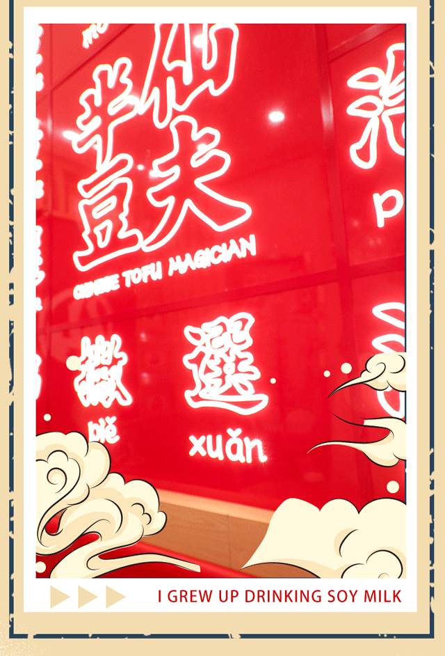 店风主打的国潮风非常夺人眼球,以传统正红色底,原木调的井格门头,粗黑的“半仙豆夫”四个大字,鲜亮明显。