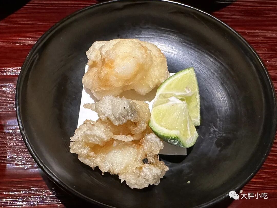 中間是小塊的天婦羅。擠上一點青檸汁。麵皮薄脆,裡面的目魚有點嚼勁,相當好吃。