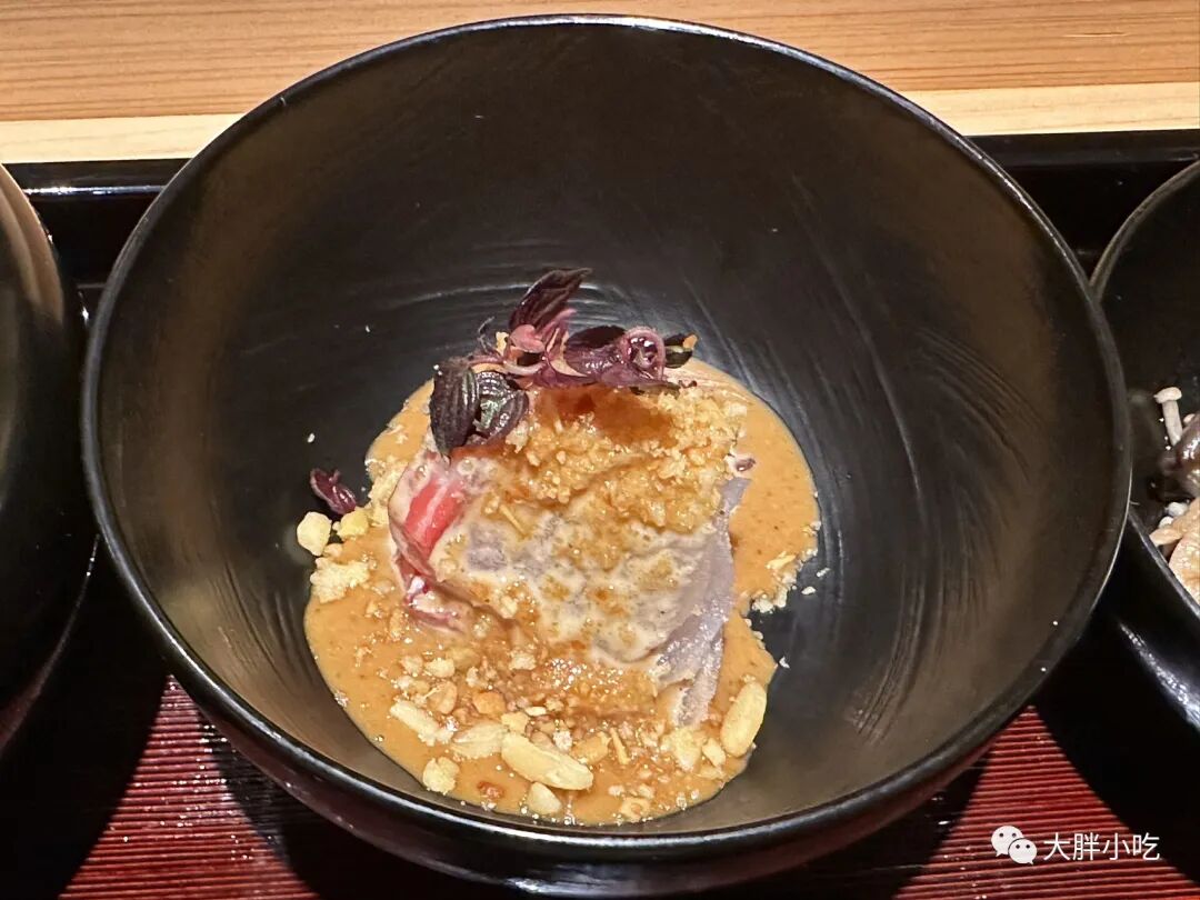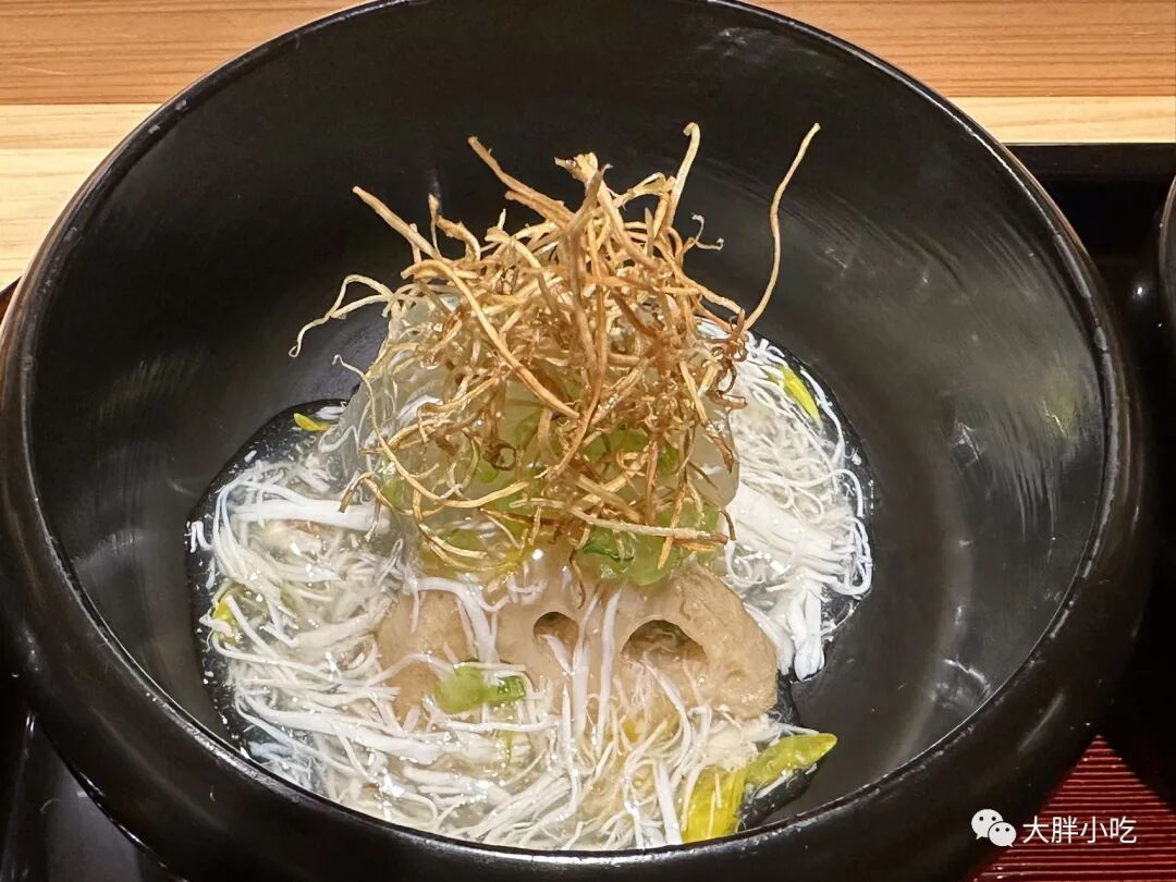 左上角的蔬菜是冬瓜和蓮藕,澆上蟹肉做成的白汁,趕上烤製的牛蒡絲。吃起來很清爽,也帶著鮮美。
