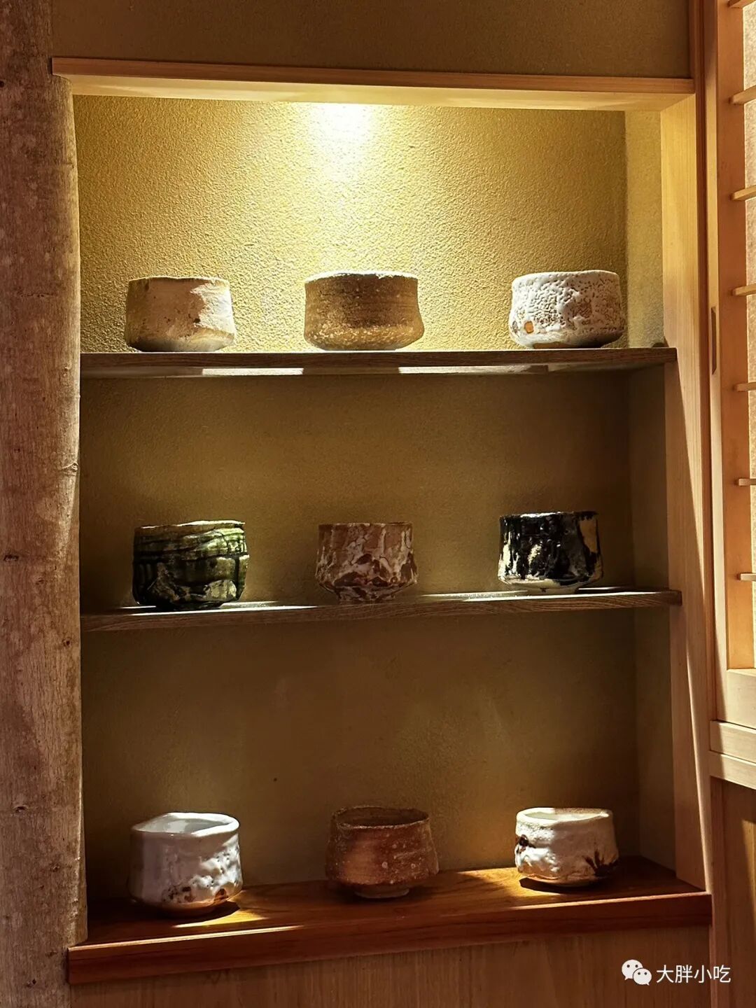 朋友提前一個多月才預定到座位。按時來到東銀座的一條小街,銀座稻葉低調地在一座商務樓的一樓。落座後看到正對著我們座位到壁龕裡,陳列9只茶碗,都很有朴拙的禪意。