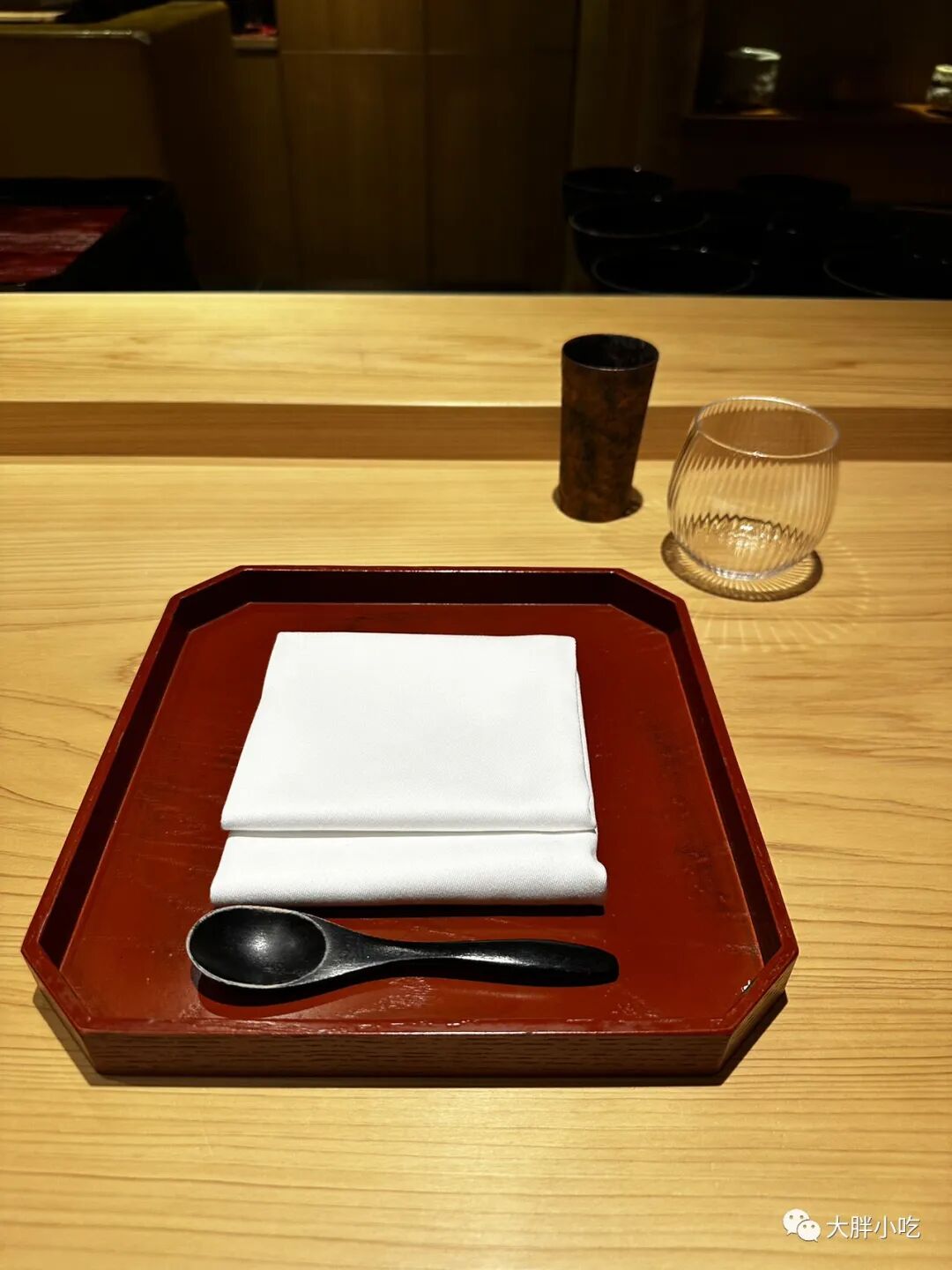 台上擺著一個木托盤,上面放著一塊白色布巾,一把小木勺。前方右側有兩個杯子。金屬的細高杯,可以選擇鮮橘水或番茄汁。玻璃杯可以倒入冰綠茶或冰焙茶。
