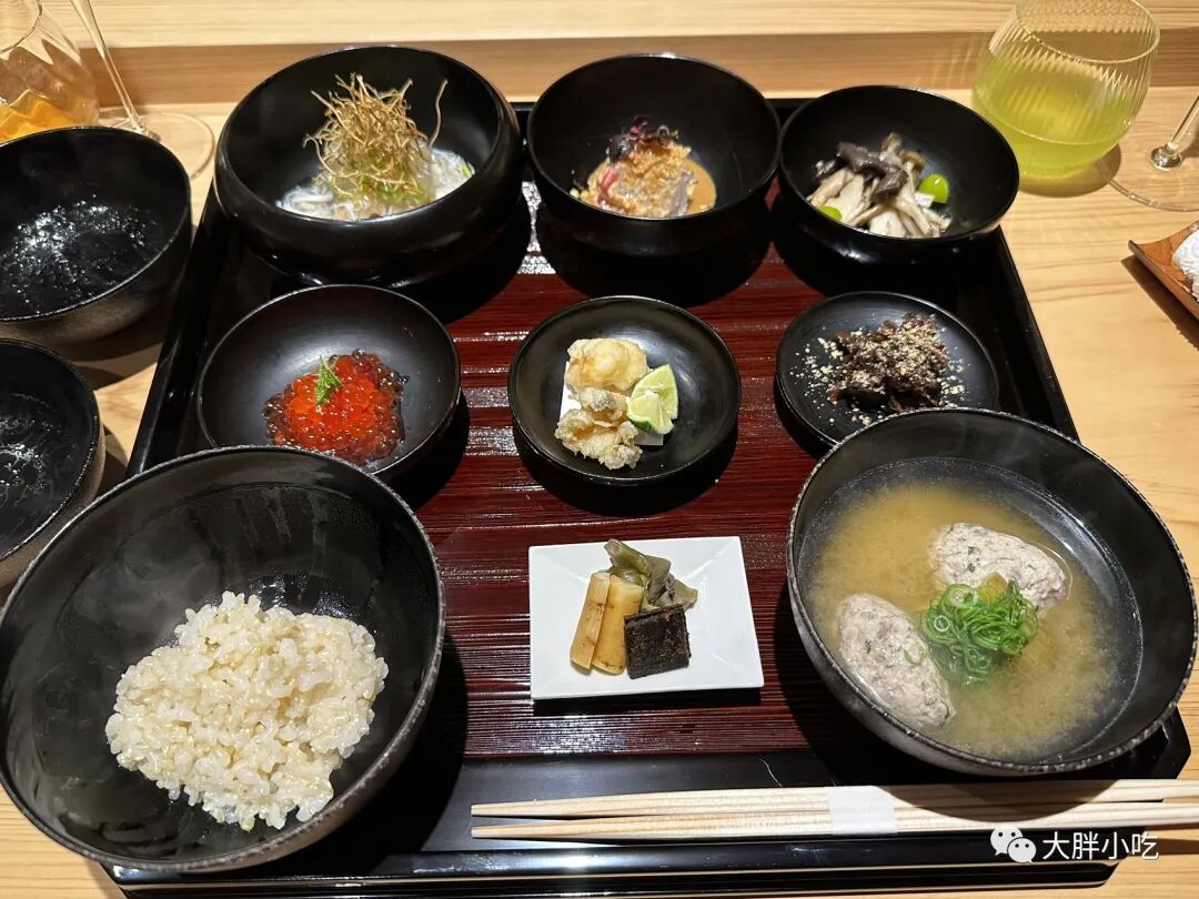 吧台裡的烤爐上,年輕的廚師忙碌著,另一位年輕廚師正在佈置著一個個餐盤。大廚則巡迴指導著。開設早餐倒是給了年輕廚師實踐的機會。廚師來詢問大家要吃什麼米飯,有白飯和糙米飯的選擇。不一會兒,木製餐盤送到了食客面前。裡面有9款。