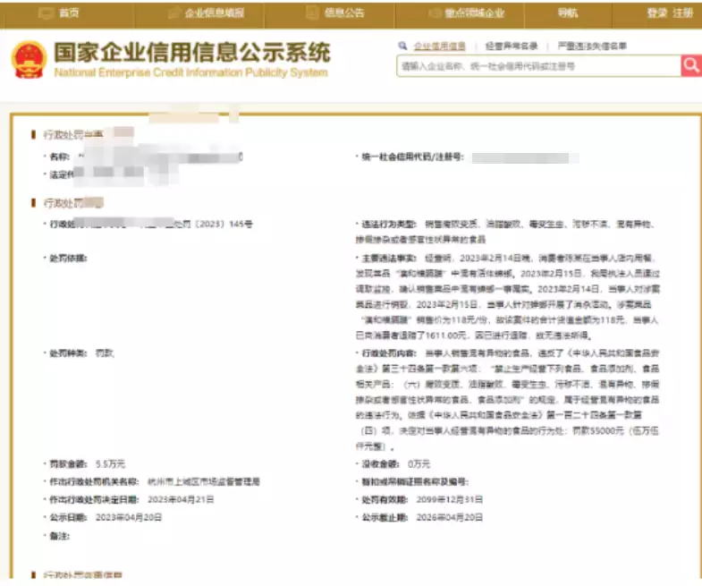 执法人员表示,店家的行为违反了《中华人民共和国食品安全法》第三十四条第一款第六项: “警止生产经营下列食品、食品添加剂、食品相关产品: (六)腐败变质、油脂酸败、毒变生虫、污秽不洁、混有异物、掺假掺杂或者感官性状异常的食品、食品添加剂”的规定,属于经营混有异物的食品的违法行为,依据《中华人民共和国食品安全法》第一百二十四条第一款第(四) 项,决定对当事人经营混有异物的食品的行为处: 罚款55000元。