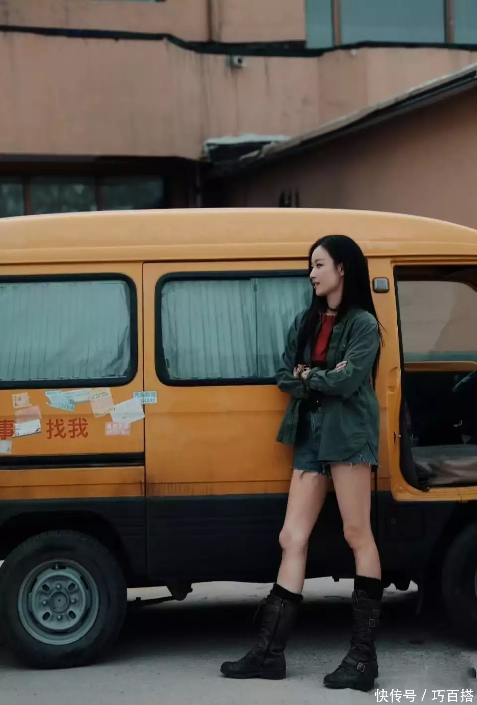第三点需要大家注意的是秀身材,军绿色衬衫和深蓝色超短裤,不费力就显示出了大长腿。