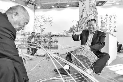 9月23日,河南省漯河市具有地方特色的“杜曲镇竹编馆”里,村民正在手工编织竹筐。焦海洋摄/光明图片