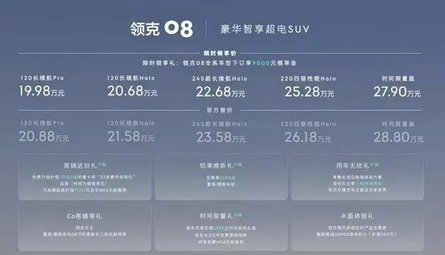 近日,领克08正式上市,全系共推出5款车型,售价20.88-28.80万元。全系均采用3档DHT插电式混动布局,是CMA Evo架构下首款战略车型,采用最新魅族车技系统,CLTC最大纯电续航可达245公里。