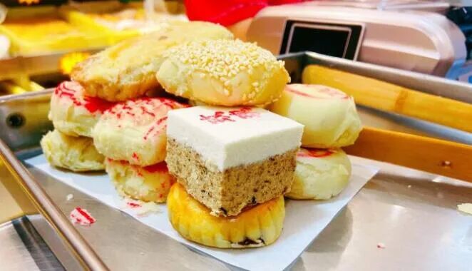 种类特别多,细水长流的总有顾客来买,高峰的时候还要排排队。老蛋糕鸡蛋味儿可浓可,软软的,适合老人和孩子。泡芙、蛋挞、牛奶棒、红豆酥等也都特别受欢迎。