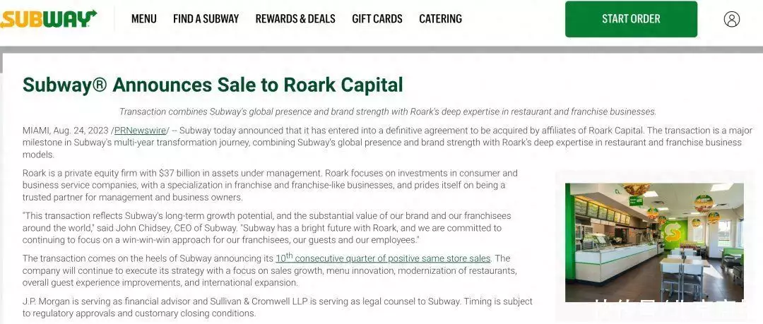 据央视财经报道,美国快餐连锁店赛百味(Subway)已同意私募股权公司Roark Capital的收购提案。