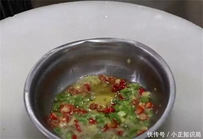 4.另起锅添入半勺食用油,油温烧至7成热时关火,再把热油泼在辣椒和姜末上面,激发出生姜和辣椒的香味。