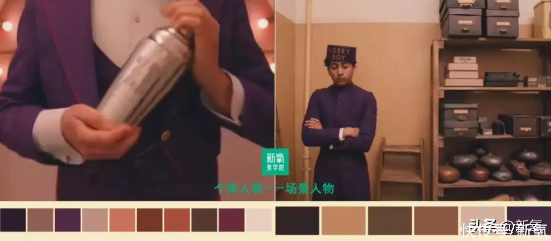 而从《布达佩斯大饭店》开始,粉紫调+纯度高的浓郁高饱和配色逐渐成为配色的主体。