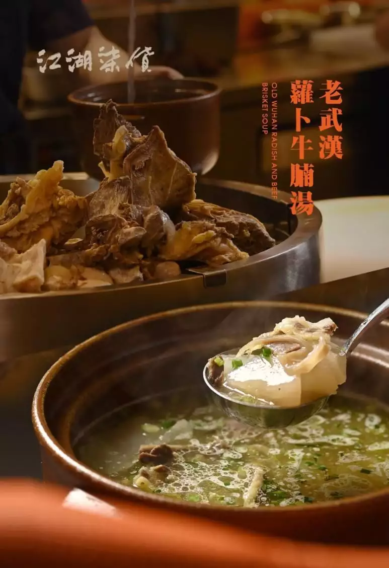 作为“江湖柒货”招牌主打菜,真材实料五斤牛骨1锅汤,萝卜选用长阳火烧坪高山萝卜,牛腩选自秦川黄牛肉,肉质细腻,久煮不柴.每锅小火慢熬6小时,汤浓味鲜,鲜香四溢。