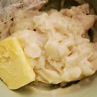 8、蒸好取出后趁热加入黄油15克,先拿硬一点的硅胶铲充分搅拌。