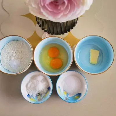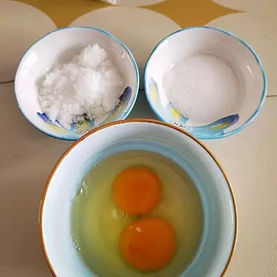 1、上: 低筋粉115克(有零有整是因为恰好用完一袋的剩余部分)+泡打粉3克 鸡蛋两个 黄油15克 下: 白糖25克,代糖15克,盐1克。