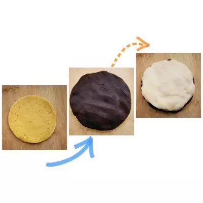12、一个饼底,一层豆沙(80克每个),一层麻薯,盖上最后一层饼底。