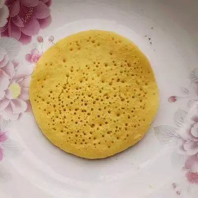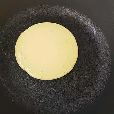 10、不粘锅中火,感受到温度后用同一个勺子倒入之前静置的面糊。要小心哦→_→ 接下来几部一定要注意温度。火大了饼底会瞬间变黑,但是饼面还没熟。