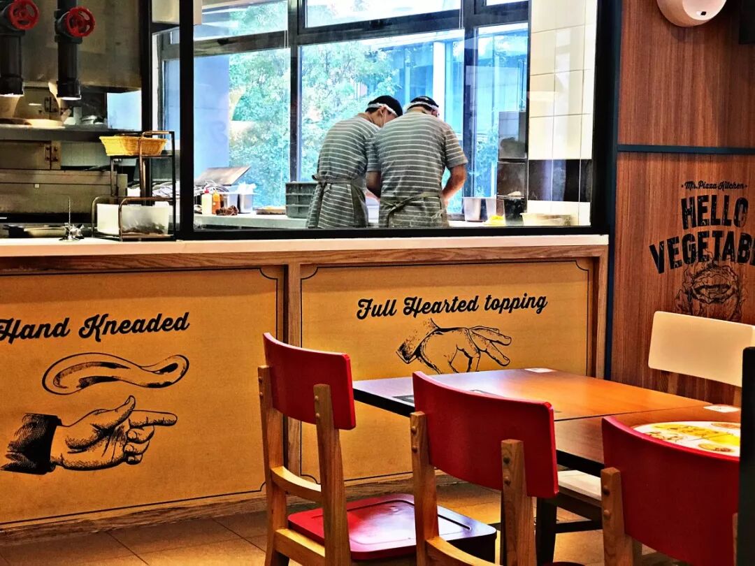 看着小哥把一大块披萨切丝,手动撒在饼皮上